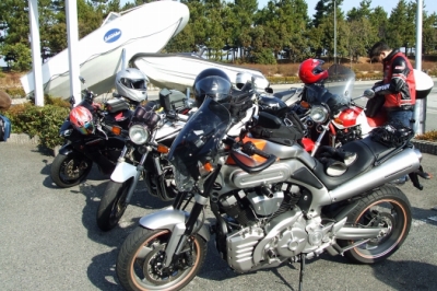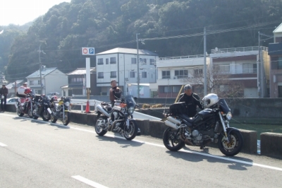 本日のメンバー ケロリンさん@VTR250、マッチャンさん@CB1300SF、丸さん@CBR1100XX、スギさん@ドカティモンスター、Ripさん@MT−01、ルーキー@CBR1000RR 残念ながら、とみきちさん@CB1000SFはお仕事のため、お見送りのみでお別れです(/_;) さて、いよいよ出発。自宅からここまでは寒かった気温も、いい具合に上昇しております。てっきりここから直で目的地へ向かうものと思ってましたら、加太を経由するとのこと。RYUBEにしては珍しい千鳥走行で淡々と加太方面に向かいます。 |