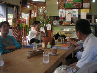 | とみきち氏は3日前にもこの店に立ち寄ったそうだ。店主も笑顔で応対してくれた。しかし片道2時間は余裕で掛かるこの喫茶店の常連とは・・・。モーニングのピザトーストはなかなか美味だった。景色も雰囲気も良い。 |