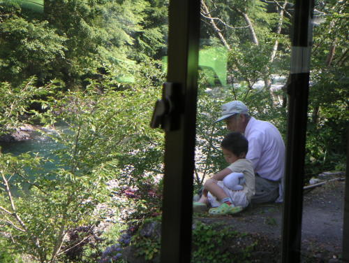 窓の外を観ると、古川の渓谷を眼下にする事ができる。ここの喫茶店のおじいちゃんと孫?お気に入りの場所なのだろう。私達が店にいる間ずっとここに二人寄り添って座っていた。