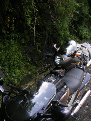 | 下りきった中原橋で休憩する予定だったが、11時を過ぎて日差しがきつくなってきた。先頭を走るとみきち氏が機転を利かせて、道路脇に湧き水が出ている所で車列を停めて休憩。水しぶきが心地良い。 大塔に下りてからは、県道53号を使って天川を目指す。私のバイク朝駆けのコース。先頭は変わらずとみきち氏。続いてT、私、後ろは丸さん。53号に入ってからTのVTRの動きが軽快になった。とみきち氏のハイペースにも楽についていっている。コーナーのラインをコーナーリング中も自由自在に変えていて、ご機嫌そうに走っているのがよく判る。ワインディングで楽しそにしているのを観るのは、三代前のEX−4以来だ。気がつけば後ろの丸さんとはだいぶ差があいていた。県道53号は今回のツーリングで一番楽しかったかも。あっという間に国道309号と交差する「かどや食堂」に到着。予定通り昼食を取る事にする。 |