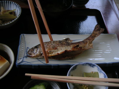| 丸さんは「途中から眠かった〜」と一言。料理がくるまでウトウトしていた。眠い時と眠くない時で極端にペースが変わるのが丸さんなのだが、相当眠かったのだろう。はるさんは「もう充分ワインディングを走ったらもういいです、帰りは南阪奈で帰ります・・・」と少々お疲れモード。 「かどや食堂」思いの他綺麗で、ゆっくりくつろぐ事ができた。「時間は掛かります」と念押しされたが鮎の塩焼きは美味しかった。そばを頼んだRip氏はその分量に物足りなさそう。メニュー選択は重要そうだ。 |